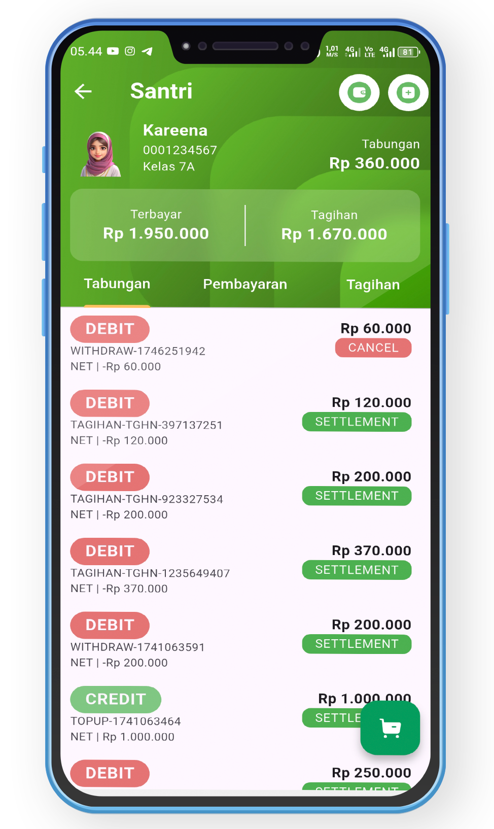 Terdapat informasi, Tagihan Siswa, Histori Pembayaran, dan tabungan